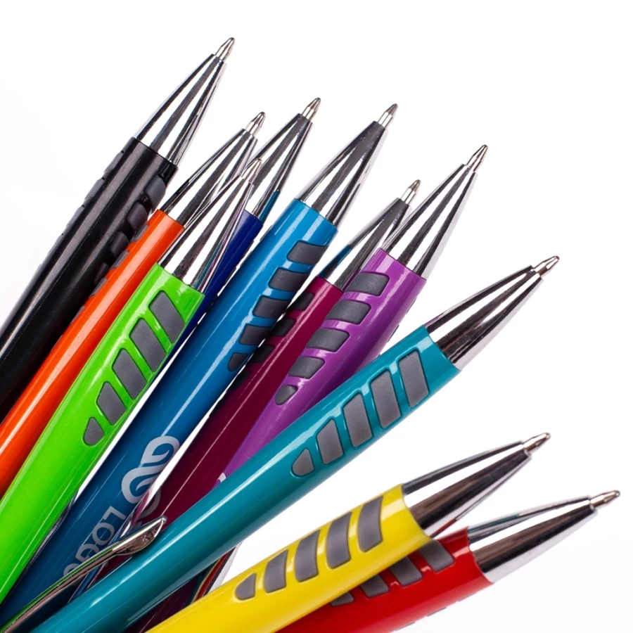 Quien desee que un bolígrafo publicitario para sus actividades de marketing sea, ante todo, cómodo de usar, estará interesado en el modelo Mercury. Este bolígrafo promocional con impresión ha sido cuidadosamente diseñado, con elementos situados justo encima de la punta para un agarre más seguro y cómodo al escribir. Los bolígrafos de plástico Merc ury están fabricados en resistente plástico ABS y están disponibles en varios colores divertidos. Otras piezas, como la punta, el clip y el botón interruptor, están fabricadas con elementos plateados. El diseño general llama la atención por su colorido y acabado. La carcasa del bolígrafo promocional Mercury puede imprimirse con cualquier logotipo o texto a un color mediante tampografía.