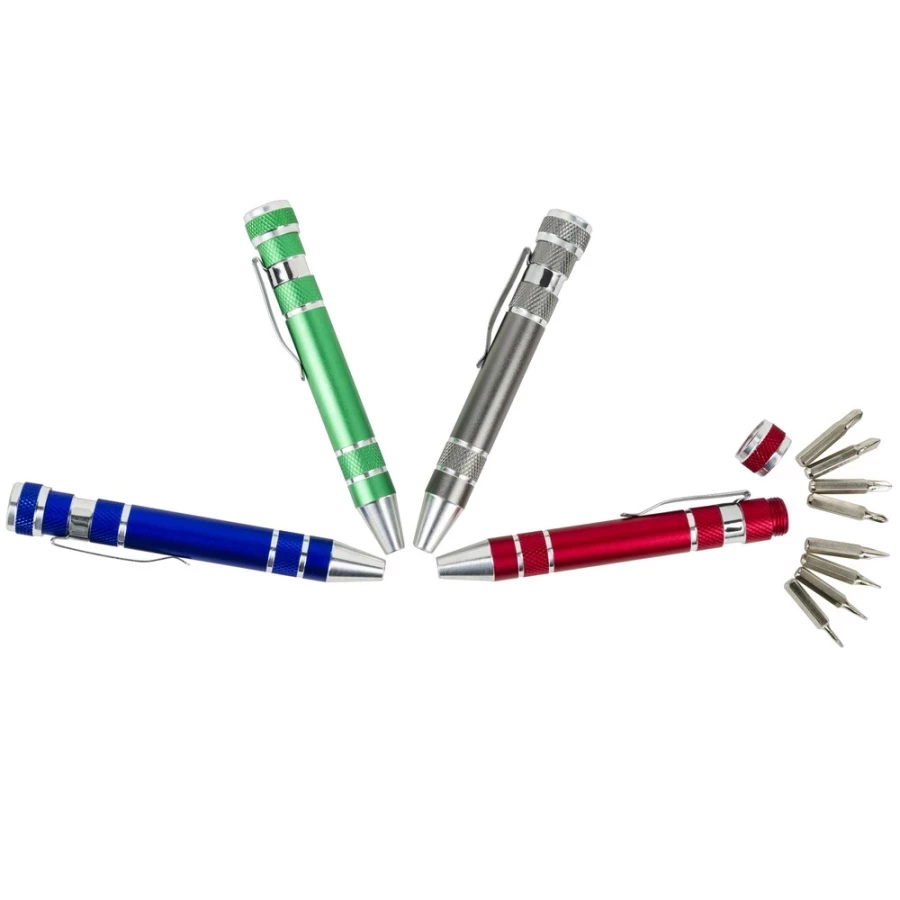 El destornillador Tate es un gadget pequeño pero multiusos que no sólo encantará a los aficionados al bricolaje. Con forma de elegante "bolígrafo", este ingenioso ayudante esconde hasta ocho puntas intercambiables -cuatro planas y cuatro Phillips- que facilitan la realización de pequeñas reparaciones en el hogar, la oficina o el taller. Fabricado en aluminio resistente, es ligero, manejable y tiene un aspecto realmente profesional. Perfecto como práctico regalo promocional que no acabará en un cajón, sino en... uso diario. Con el logotipo de su empresa en el estuche, se convierte en un funcional portador de marca, ideal para ferias, eventos promocionales o como regalo para clientes.